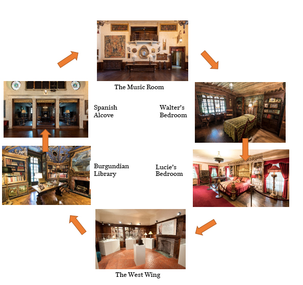 Lastly, and most complex, I created a new type of tour to experience at Caramoor. Instead of just listening to facts about the family and objects of the house, participants engage in a guided exploration, prompted with curious questions by the tour guide. Throughout the duration of the Renaissance tour I designed, participants are steered to learn about the social and political context at the beginning of the Renaissance, as well as the defining characteristics of Renaissance art and architecture. They are taken into six spaces to discover disparate but thematically connected objects collected by the Rosens. These spaces include the Music Room, Spanish Alcove, Burgundian Library, Lucie’s Bedroom, Walter’s Bedroom, and the New Wing. Their context may not be obvious until you discover this theme!