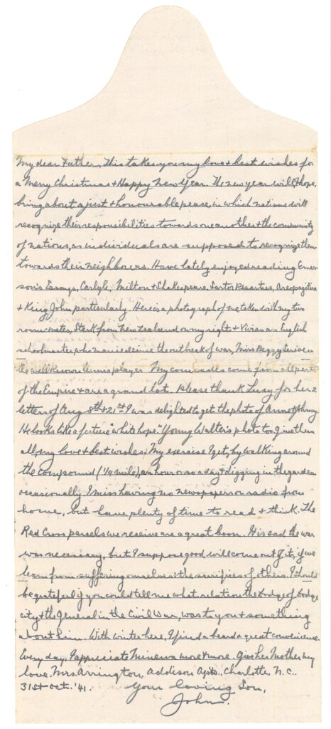 My dear Father, this takes you my love and best wishes for a Merry Christmas & Happy New Year. The new year will, I hope, bring about a just & honorable peace in which nations will recognize the responsibilities towards one another + the community of nations, as individuals are supposed to recognize these towards their neighbors. Have lately enjoyed reading Emerson’s Essays, Carlyle, Milton & Shakespeare, Sartor Resartus, Areopagitica & King John particularly. Here is a photograph of me taken with my two room-mates, Stark from New Zealand on my right & Vivian an English schoolmate who married since the outbreak of war, Miss Peggy Scriven the well known tennis player. My comrades come from all parts of the Empire & are a grand lot. Please thank Lucy for her 2 letters of Aug 8th + 21st. I was delighted to get the photo of Anne & Johnny. he looks like a future “white hope.” Young Walters’ photo too. Give them all my love + best wishes. My exercise I get by walking around the compound (¼ mile), an hour or so a day + digging in the garden occasionally. I miss having no newspapers or radio from home, but have plenty of time to read + think. The Red Cross parcels we receive are a great boon. It is sad the war was necessary, but I suppose good will come out of it, if we learn from suffering ourselves + the sacrifices of others. I should be grateful if you would tell me what relation the Dodge of Dodge city + the general in the Civil War, was to you + something about him. With winter here, I find a beard a great convenience. Every day, I appreciate Mineva more & more. Give her Mother my love. Mrs. Arrington, Addison Apts. Charlotte, N.C. 31st Oct. ’41