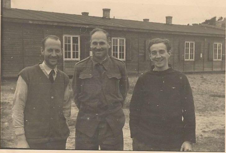 My dear Father, this takes you my love and best wishes for a Merry Christmas & Happy New Year. The new year will, I hope, bring about a just & honorable peace in which nations will recognize the responsibilities towards one another + the community of nations, as individuals are supposed to recognize these towards their neighbors. Have lately enjoyed reading Emerson’s Essays, Carlyle, Milton & Shakespeare, Sartor Resartus, Areopagitica & King John particularly. Here is a photograph of me taken with my two room-mates, Stark from New Zealand on my right & Vivian an English schoolmate who married since the outbreak of war, Miss Peggy Scriven the well known tennis player. My comrades come from all parts of the Empire & are a grand lot. Please thank Lucy for her 2 letters of Aug 8th + 21st. I was delighted to get the photo of Anne & Johnny. he looks like a future “white hope.” Young Walters’ photo too. Give them all my love + best wishes. My exercise I get by walking around the compound (¼ mile), an hour or so a day + digging in the garden occasionally. I miss having no newspapers or radio from home, but have plenty of time to read + think. The Red Cross parcels we receive are a great boon. It is sad the war was necessary, but I suppose good will come out of it, if we learn from suffering ourselves + the sacrifices of others. I should be grateful if you would tell me what relation the Dodge of Dodge city + the general in the Civil War, was to you + something about him. With winter here, I find a beard a great convenience. Every day, I appreciate Mineva more & more. Give her Mother my love. Mrs. Arrington, Addison Apts. Charlotte, N.C. 31st Oct. ’41