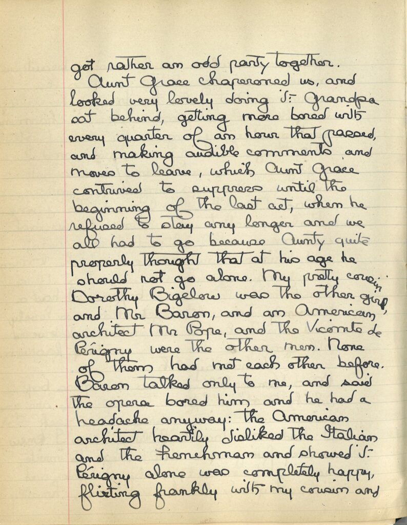 Transcription: “Mrs. Vanderbilt sent us an opera box which Mother left me to fill while she and Lionel went with young Mrs. Jack Astor. I had some trouble filling it as I knew so very few people well enough to invite, having been in N.Y. only 2 nights and met everybody for the first time. Finally I got rather an odd party together. Aunt Grace chaperoned us, and looked very lovely doing it. Grandpa sat behind getting more bored with every quarter of an hour, making audible comments and moves to leave, which Aunt Grace contrived to suppress until the beginning of the last act, when he refused to stay any longer and we had all to go because Aunty quite properly thought that at his age he should not go alone. My pretty cousin Dorothy Bigelow was the other girl and Mr. Baron, and an American architect Mr Pope, and the Visconte de Perigny were the other men. None of them had met each other before. Baron talked only to me and said the opera bored him and he had a headache anyway: the American architect heartily disliked the Italian and the Frenchman and showed it. Perigny alone was completely happy, flirting frankly with my cousin and me. I could have been a good deal amused at the contents of my box if I had not been disturbed by reflecting that they were too utterly uncongenial to enjoy themselves.”