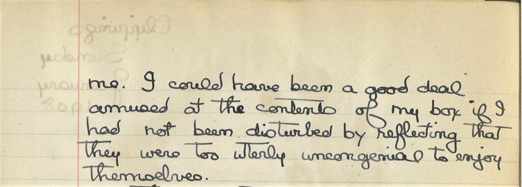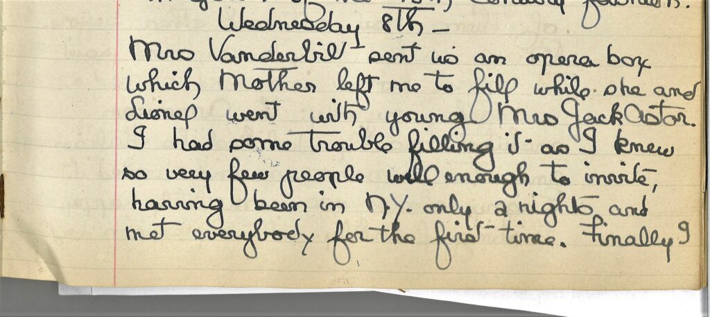 Transcription: “Mrs. Vanderbilt sent us an opera box which Mother left me to fill while she and Lionel went with young Mrs. Jack Astor. I had some trouble filling it as I knew so very few people well enough to invite, having been in N.Y. only 2 nights and met everybody for the first time. Finally I got rather an odd party together. Aunt Grace chaperoned us, and looked very lovely doing it. Grandpa sat behind getting more bored with every quarter of an hour, making audible comments and moves to leave, which Aunt Grace contrived to suppress until the beginning of the last act, when he refused to stay any longer and we had all to go because Aunty quite properly thought that at his age he should not go alone. My pretty cousin Dorothy Bigelow was the other girl and Mr. Baron, and an American architect Mr Pope, and the Visconte de Perigny were the other men. None of them had met each other before. Baron talked only to me and said the opera bored him and he had a headache anyway: the American architect heartily disliked the Italian and the Frenchman and showed it. Perigny alone was completely happy, flirting frankly with my cousin and me. I could have been a good deal amused at the contents of my box if I had not been disturbed by reflecting that they were too utterly uncongenial to enjoy themselves.”