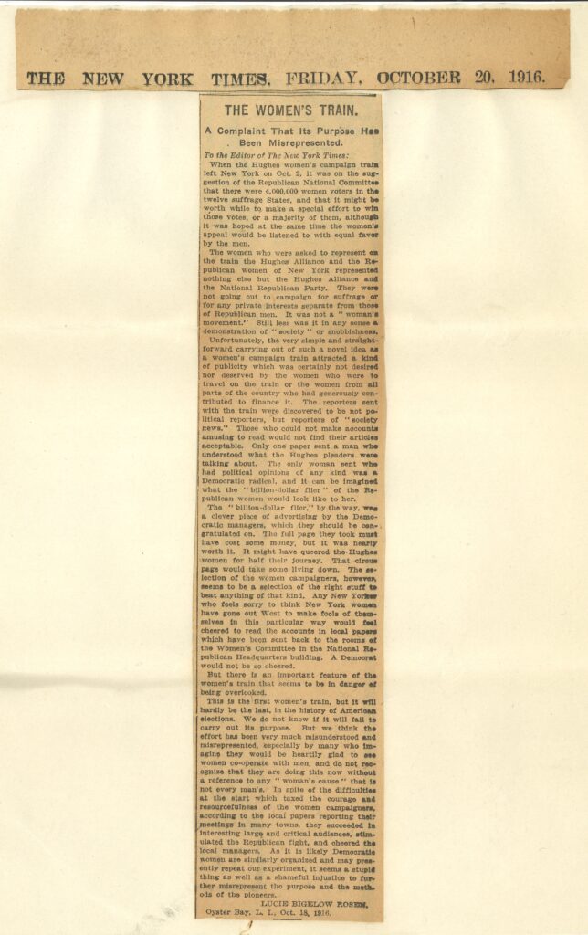 Though the campaigners’ travels were reported in regional and local press, Lucie Bigelow Rosen felt the reports of the women’s efforts lacked seriousness. “The reporters sent with the train”, Mrs. Rosen wrote in a letter to the editor of The New York Times on October 20, “were discovered to be not political reporters but reporters of ‘society news.’ Those who could not make accounts amusing to read would not find their articles acceptable.” The speaking talents of social reformer Katharine Bement Davis, of writer Mary Antin and of others, were overshadowed by the tales of the “Billion Dollar Special”—as some reporters dubbed the train, owing to financial support for the venture provided by wealthy New York society women. Mrs. Rosen, who was an active supporter of suffrage in New York, wrote in defense of the effort: “This is the first women’s train, but it will hardly be the last, in the history of American elections…it seems…a shameful injustice to further misrepresent the purpose and the methods of the pioneers.”
