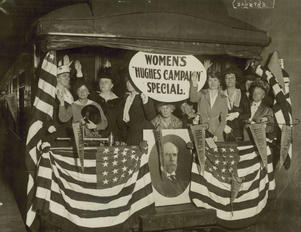 In the fall of 1916, a tight presidential race between Democrat President Woodrow Wilson and Republican candidate Charles Evans Hughes emerged. To win, the Republican party sought to attract the four million eligible women voters in the twelve states where women could vote for the president (as the 19th Amendment granting women the right to vote nationwide was not ratified until August 18, 1920): Wyoming, Utah, Colorado, Idaho, Washington, California, Oregon, Arizona, Montana, Nevada, Kansas, and Illinois. How to do this? By sending a train full of women supporters to campaign for Hughes on a tour through the country, targeting the female audience in these twelve suffrage states.