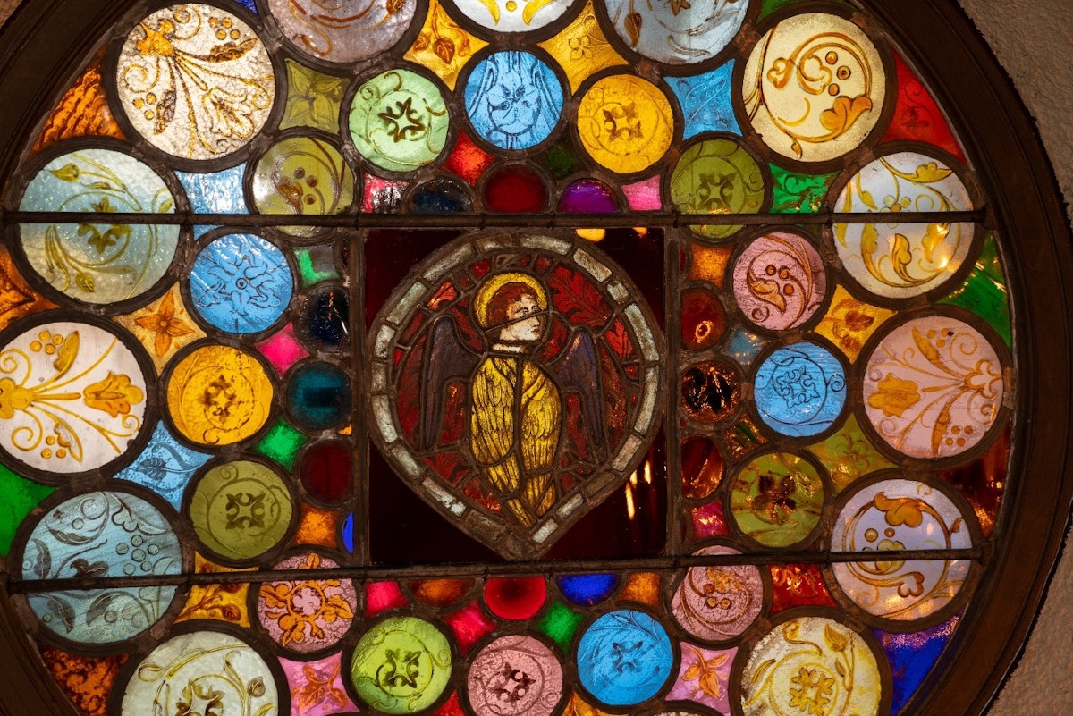 The windows in the north wall of the music room feature (left to right) a seraph (detail shown below; plural: seraphim), two knights (possibly donors) flanking the loggia above the Spanish Alcove, and an angel playing a trumpet.