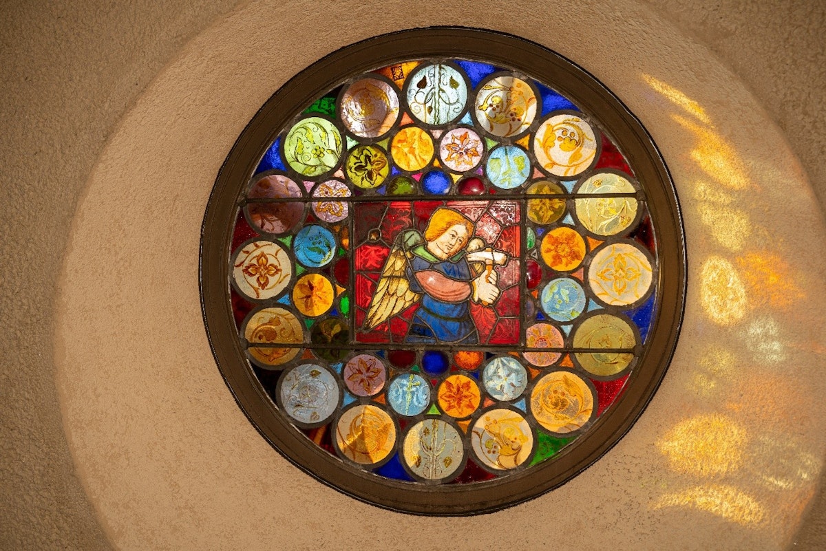 To enable viewers to appreciate the richness of these windows from below, the portholes in the thick walls were designed with downward-sloping sills.