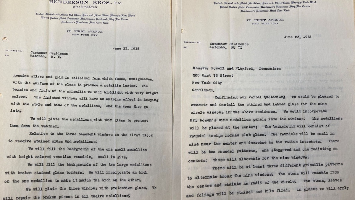 To fit the squarish panels into the large round window openings designed by Caramoor’s architect Christian Rosborg, Walter Rosen engaged Henderson Brothers, a noted Manhattan firm in business from the late 19th- to the mid-20th-century that specialized in leaded, stained, and metal-set glass windows.