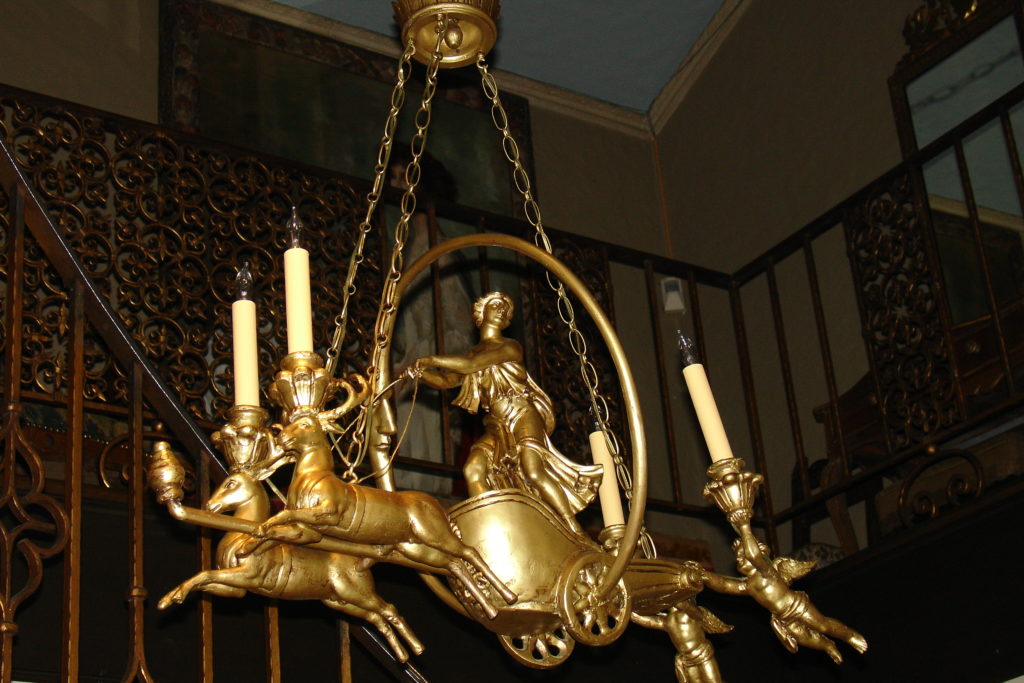 The Chariot of Diana III, a 20th-century giltwood light fixture inside the Rosen House.