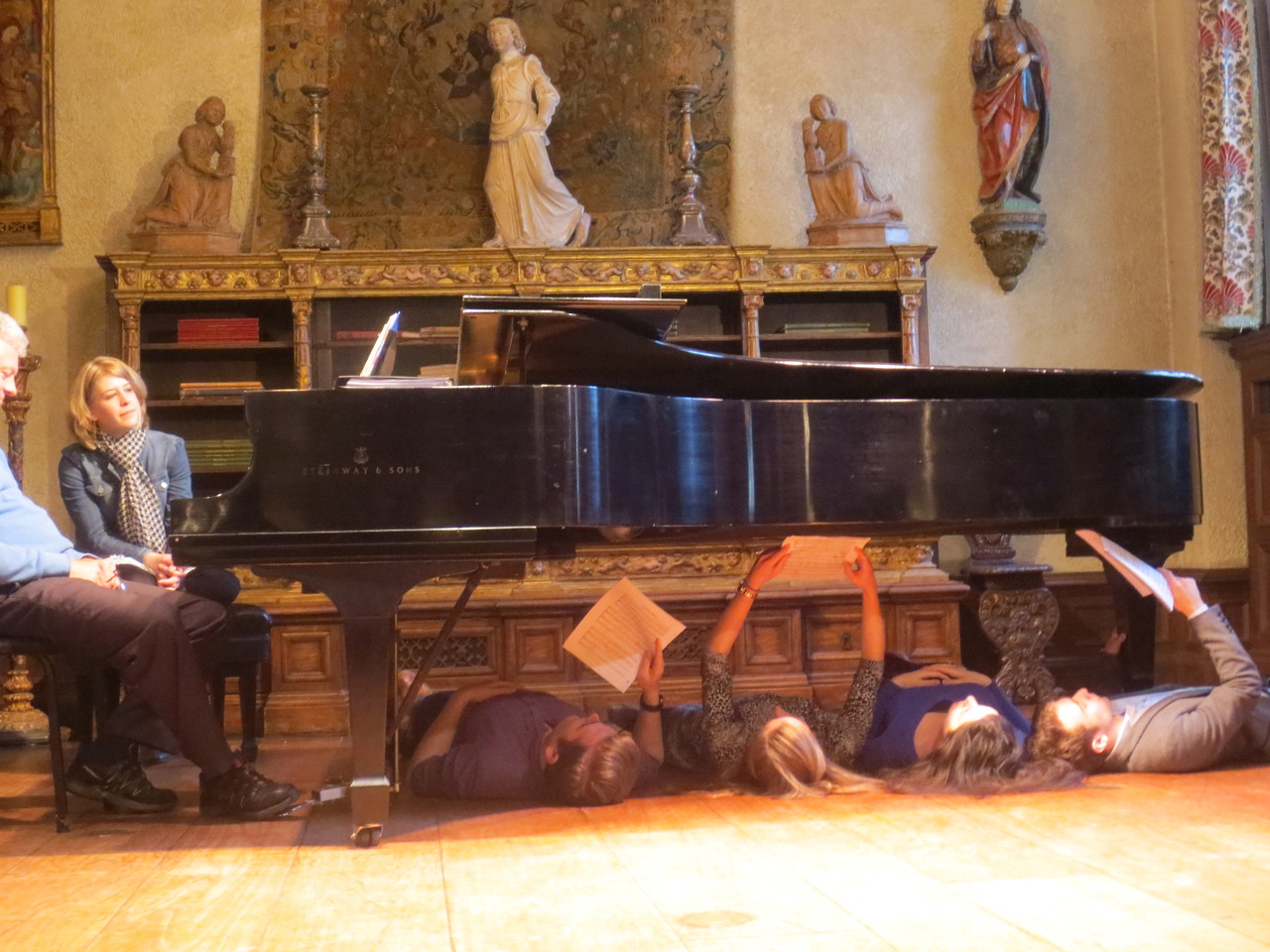 (4) The cast decided they wanted to sing their a capella Stenhammar piece lying under the piano, just as we’d done two years ago rehearsing the Blitzstein quartet “In Twos.” They’d read about it and seen the picture on this blog, and they decided they needed to revive the tradition. This time we made sure Gabe Palacio, the photographer, was around to capture it. And I got a shot of Gabe on the floor with them as he took his pictures.