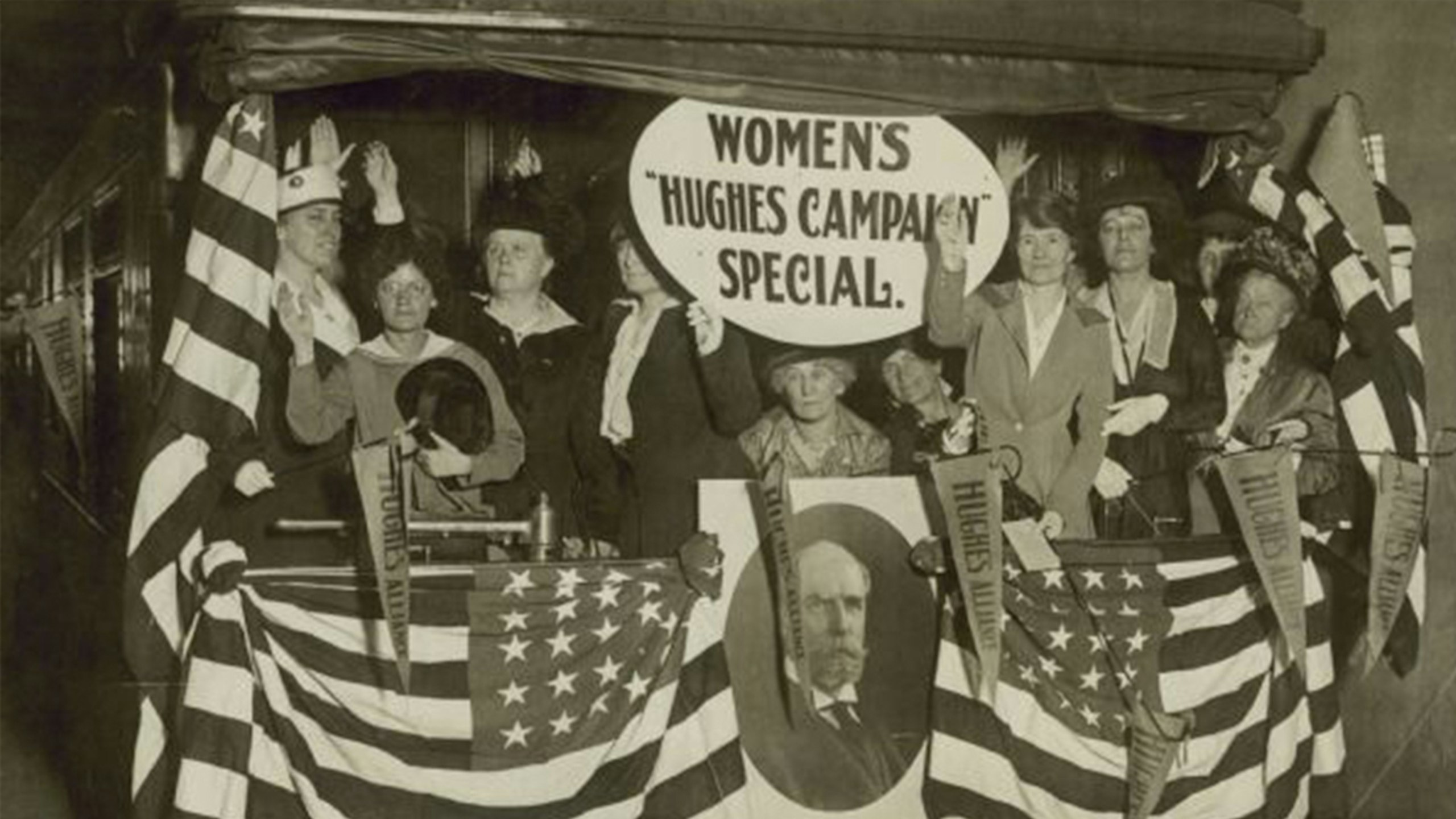 In the fall of 1916, a tight presidential race between Democrat President Woodrow Wilson and Republican candidate Charles Evans Hughes emerged. To win, the Republican party sought to attract the four million eligible women voters in the twelve states where women could vote for the president (as the 19th Amendment granting women the right to vote nationwide was not ratified until August 18, 1920): Wyoming, Utah, Colorado, Idaho, Washington, California, Oregon, Arizona, Montana, Nevada, Kansas, and Illinois. How to do this? By sending a train full of women supporters to campaign for Hughes on a tour through the country, targeting the female audience in these twelve suffrage states.