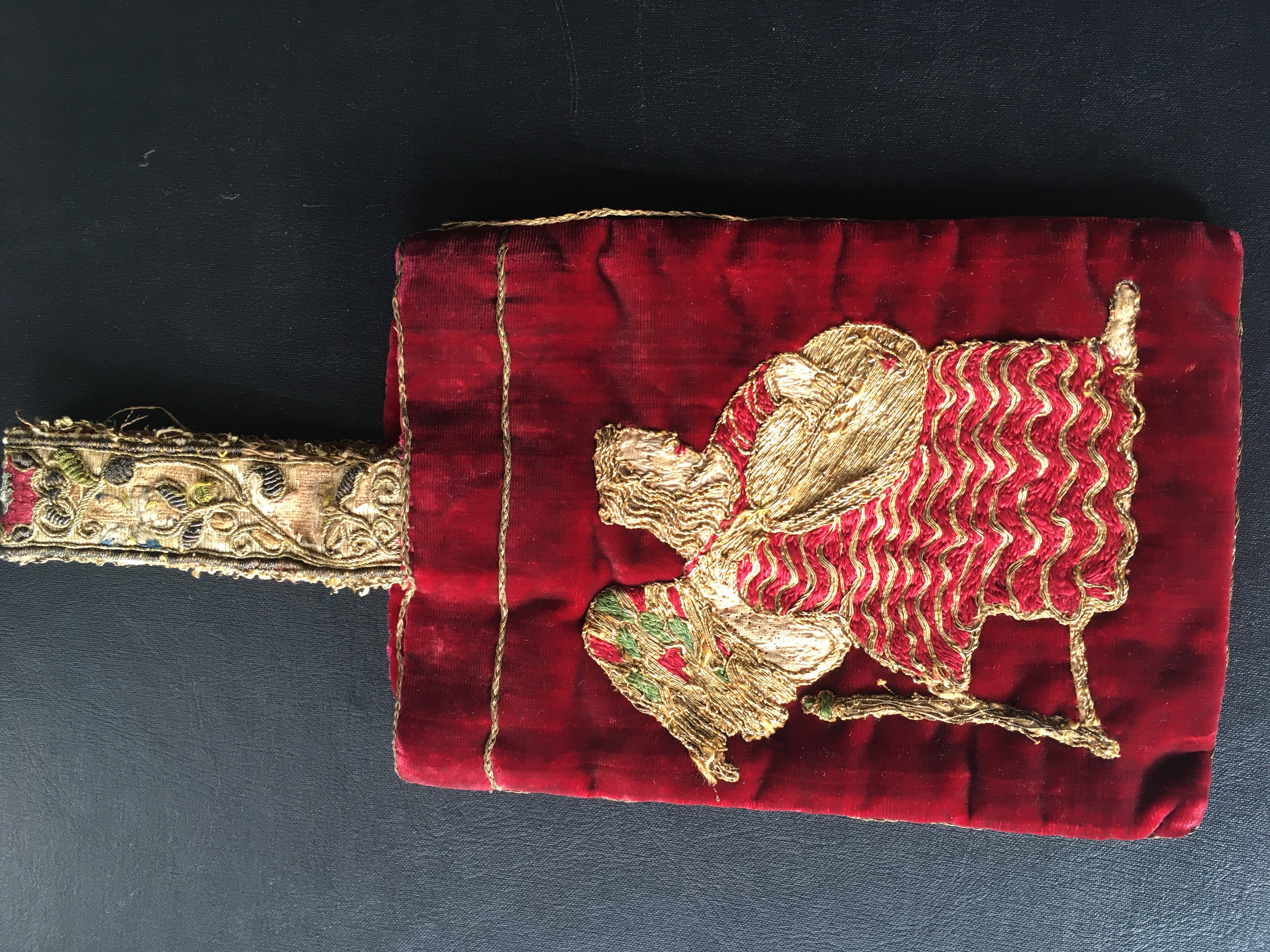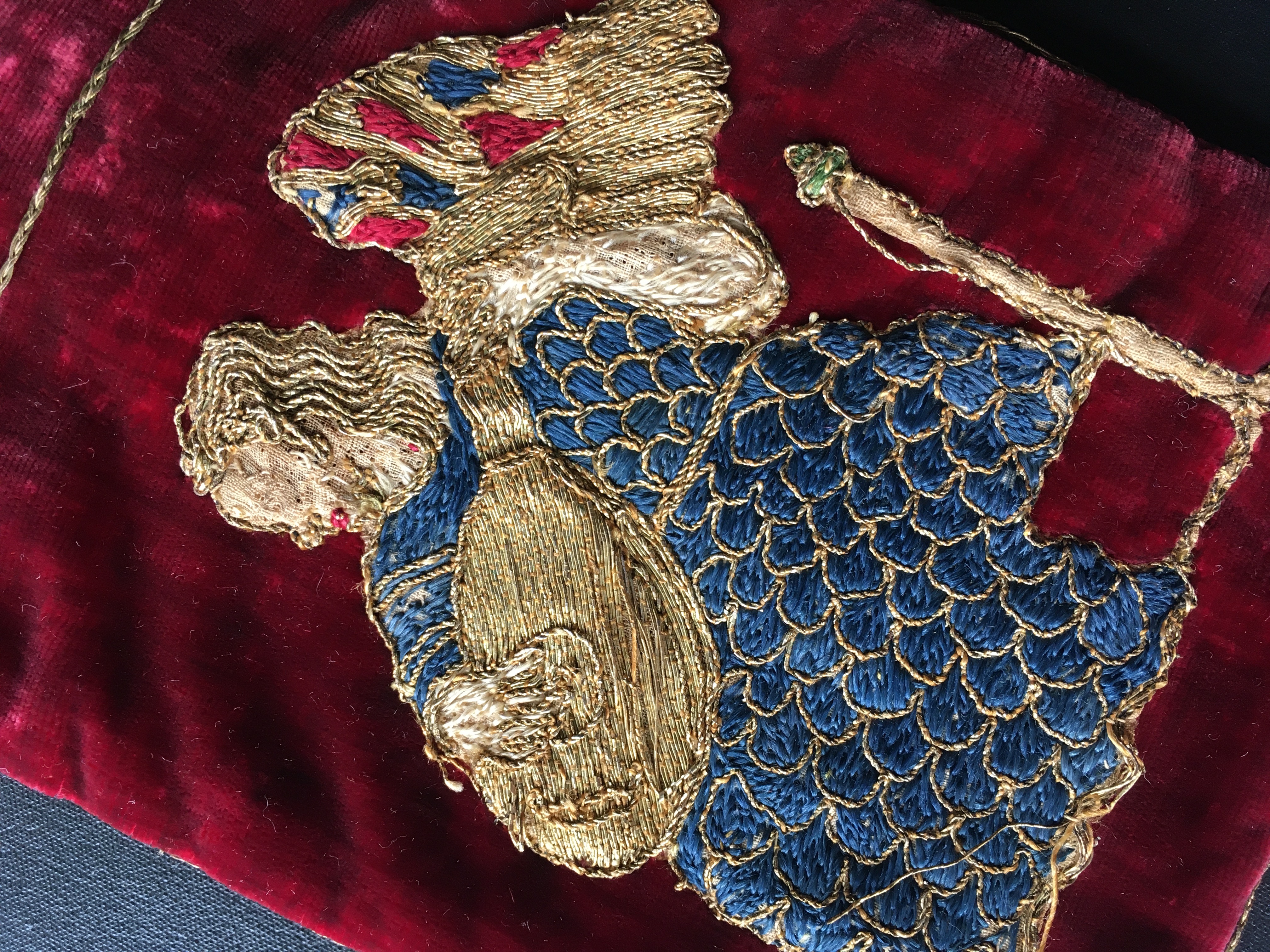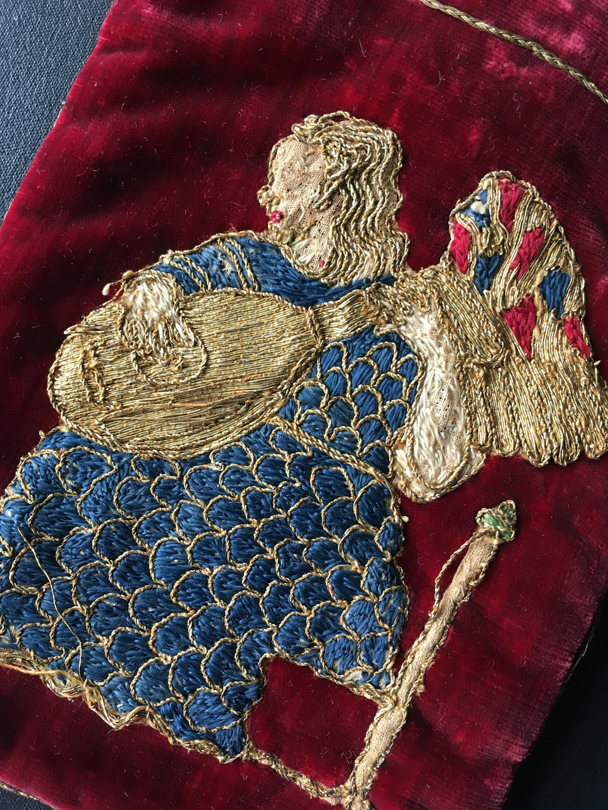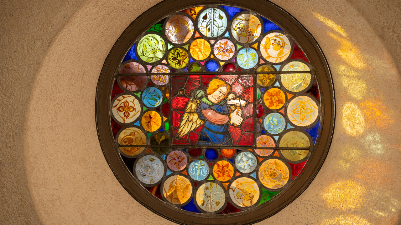 The five windows on the south wall of the music room (facing the Spanish Courtyard) portray angels holding symbols of the “Passion of the Christ” (Jesus’ suffering and crucifixion), specifically (left-to-right): nails, a spear or lance, a whip, a hammer (shown below), and pincers. The religious subject of the panels lends credence to Seligman’s provenance notes tracing them to the “main church of Baden” in the Swiss canton of Aargau.