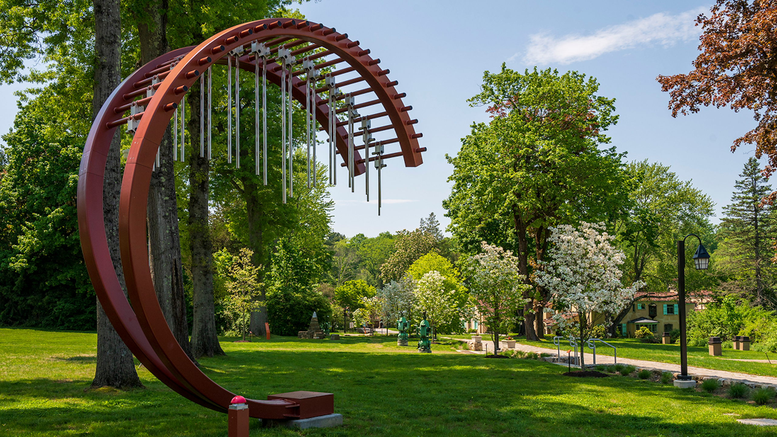When Caramoor first asked Trimpin to create a permanent sound art sculpture in celebration of its 75th Anniversary, the world-renowned sound artist thought about Caramoor’s acoustical environment: the birds singing, the wind in the trees, and the blissful absence of street noise. He then conceived of in“C”, the interactive kinetic sculpture shaped as a 16-foot high double letter C now located in the entry plaza, welcoming guests as they arrive. From the top of the C’s curve, 24 tuned metal bell chimes ranging over two octaves are suspended. Made out of steel and utilizing electromechanical components, in“C” interacts with visitors through a motion sensor (as you approach, its melodious chimes draw you closer) and through the physical activation of a push-button panel (don’t be shy!). The push-buttons activate the structure’s chimes to play pre-composed short pieces, each 1–2 minutes long. In addition to Trimpin’s music, Caramoor commissioned pieces from four composers: Christopher Cerrone, Anna Clyne, Missy Mazzoli, and Nico Muhly. As Caramoor continues to work with composers, the chime-piece library will grow. When in“C” is in its education mode, a MIDI (Musical Instrument Digital Interface) keyboard enables visitors of any musical ability (or even none!) to make their own chime music, as the chimes respond to the strikes on the keyboard.